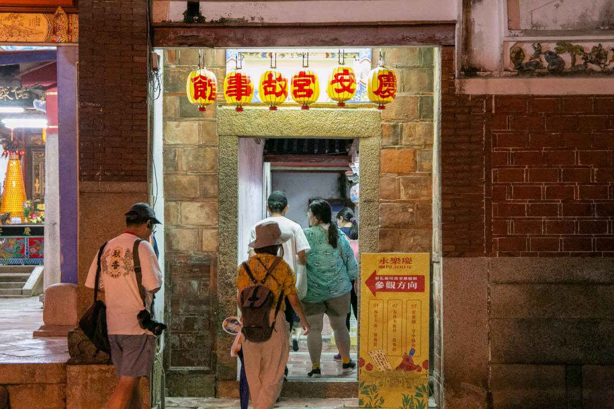 順著巷弄往前走,燈光開始描出慶安宮的屋簷。