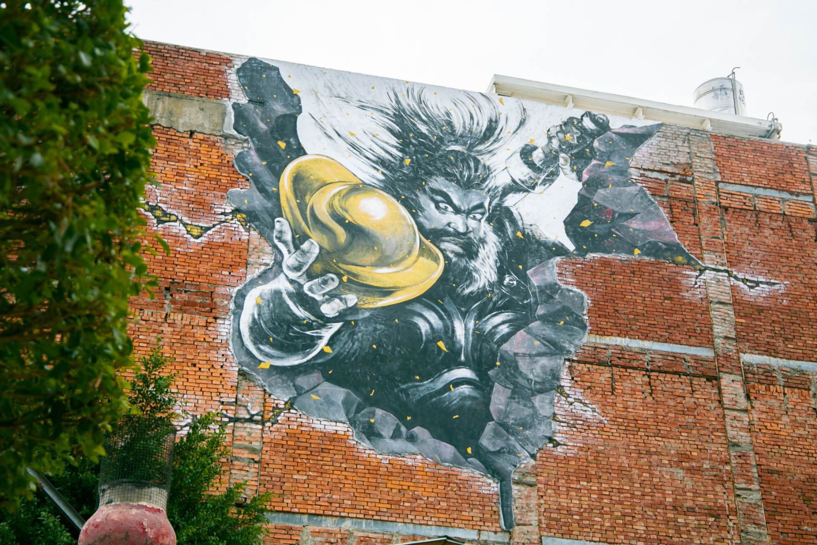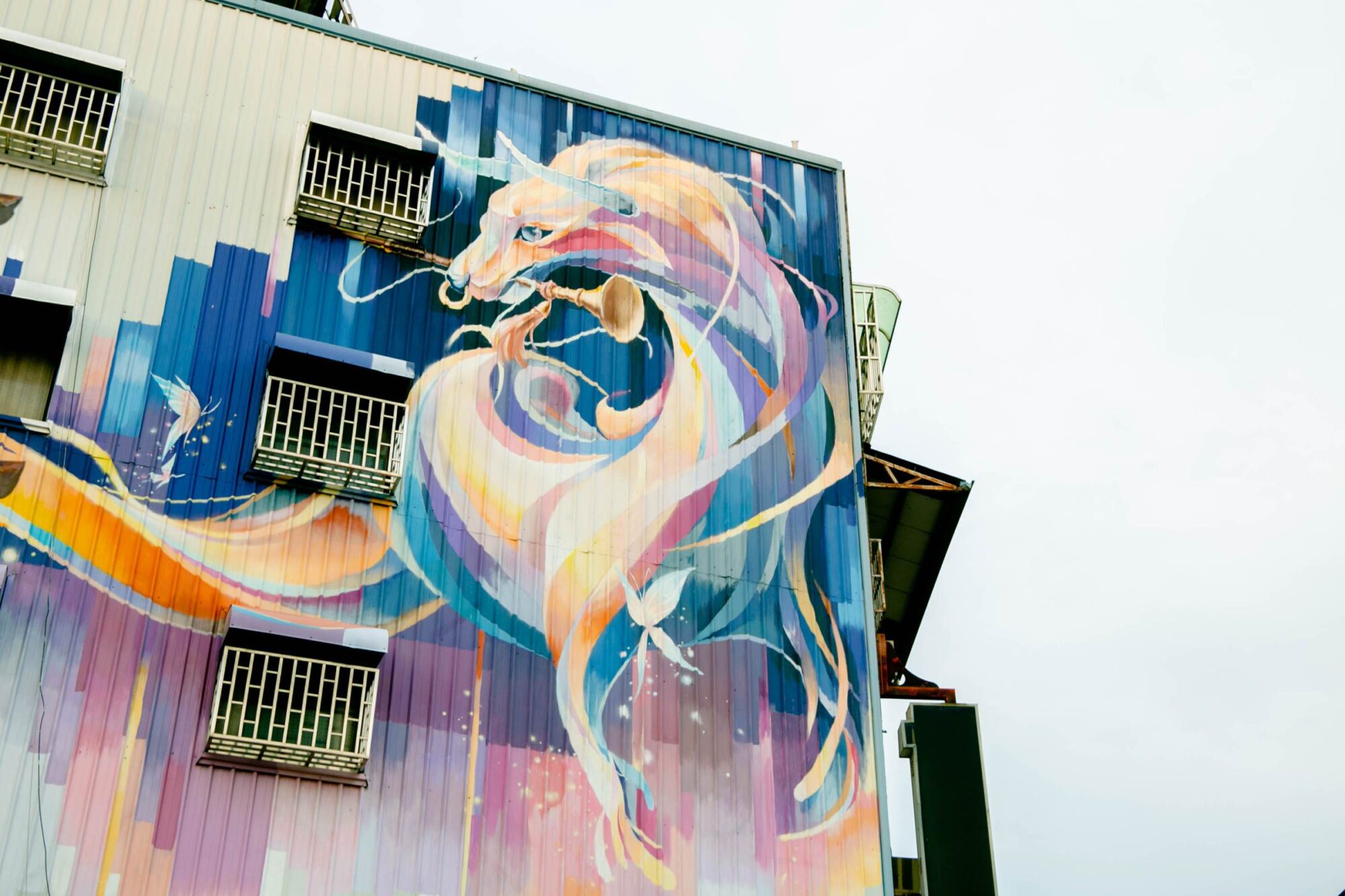 廟外牆的新壁畫,由年輕藝術家以武財神與神獸為主題創作,