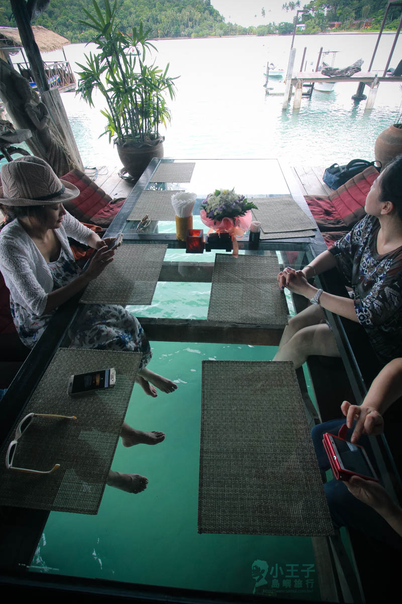 就是懸空的腳,而下面就海,這樣的特點在這個餐廳裡出現我馬上就感受到強烈的風格以及水上屋生活的特色,在搭配透明的玻璃桌,綠色的海水直接反射在透明玻璃上,這不可能用任何桌巾取代的氣氛,強化了整個用餐的體驗,至此分數已經到達高標。