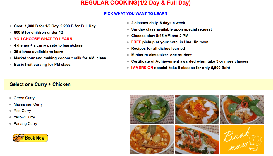 價格:半天1,300B(含五樣餐點)、全天2,200B(含十樣餐點)